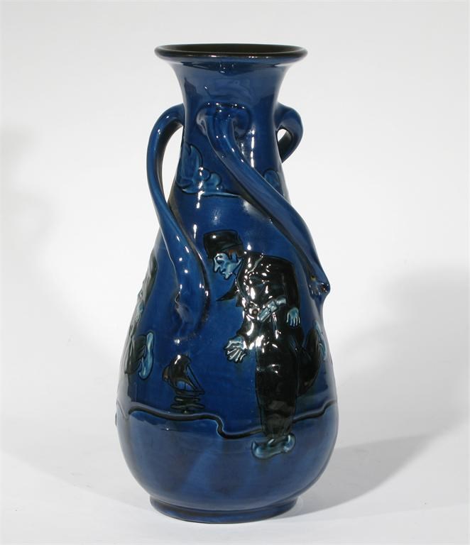 A C H Brannam, Barum pottery vase applied with three scroll handles, the body painted with Dutch men before a sailing ship, in colours on a blue ground impressed marks 28cm. high