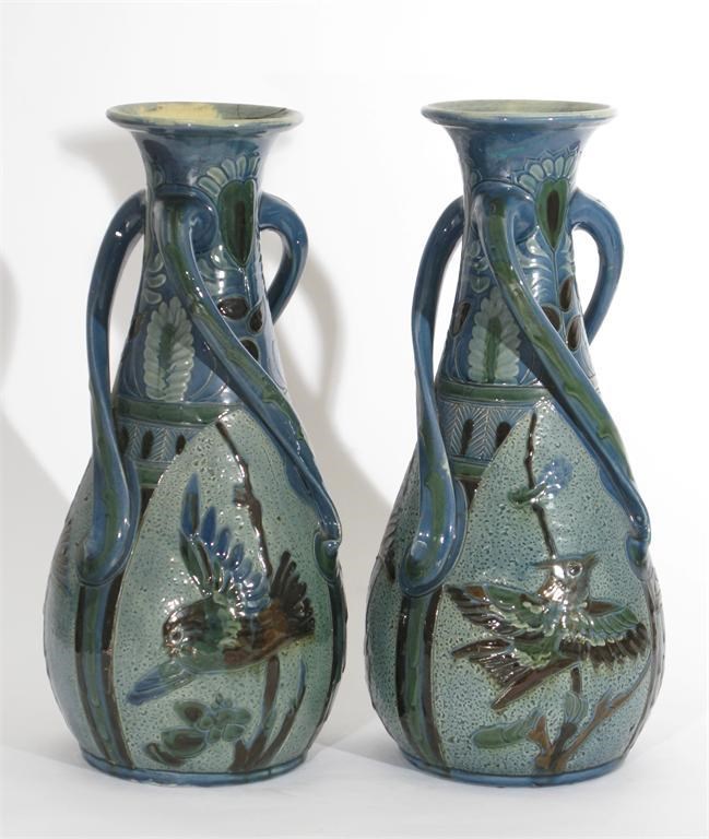 A pair of C H Brannam Barum vases by James Dewdney, with three scroll handles, incised and painted with finches, flowers and foliage, in shades of blue, green and brown incised marks, JD monogram. dated 1904, repaired rims 41cm. high
