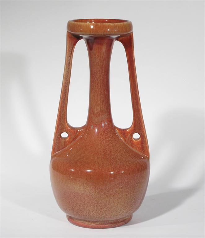 A Bretby Pottery Secessionist vase bottle form with flanking stylised handles with pierced decoration, covered in a streaked red glaze impressed marks 34cm. high