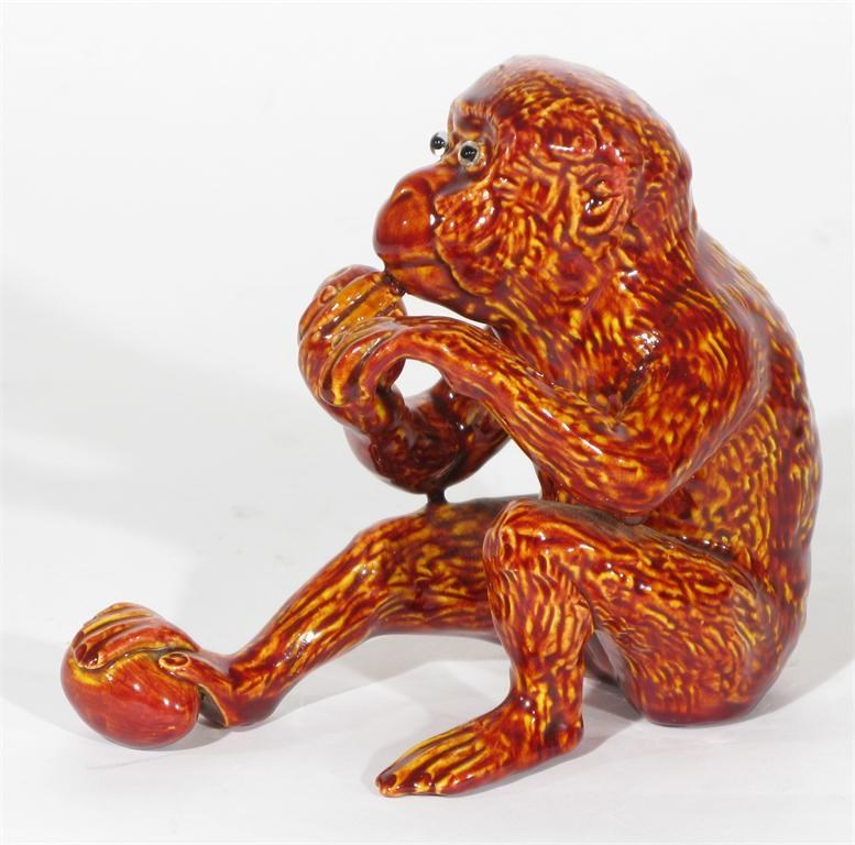 A Bretby Pottery model of a seated monkey eating a nut and holding another nut under his outstretched foot, glazed brown, with applied glass eyes impressed marks to bottom, professionally restored leg 12cm. high