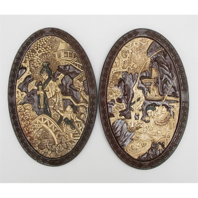 A Pair of Bretby Pottery wall plaques oval modelled with oriental scenes, glazed in brown and ivory impressed marks 38cm. high
