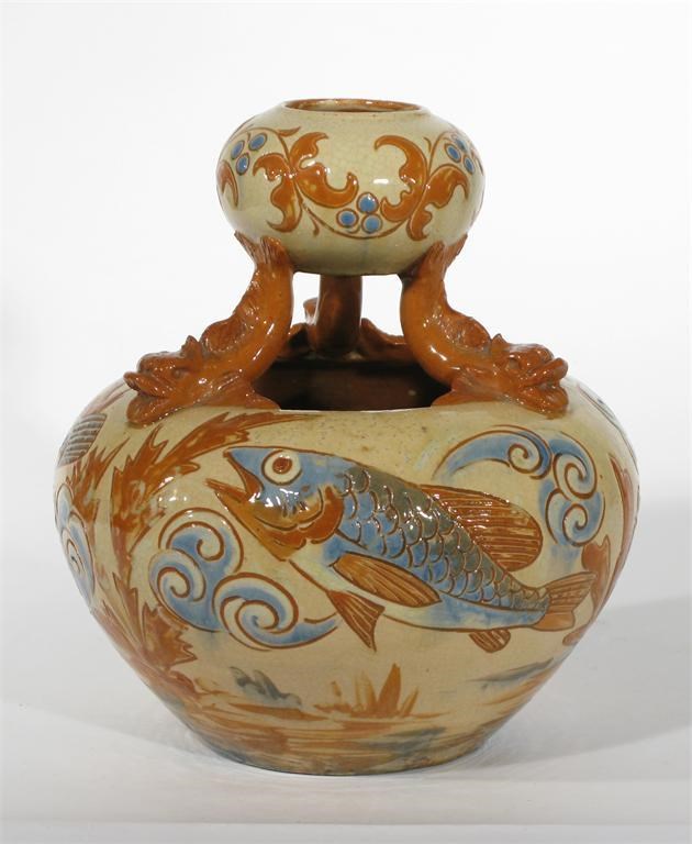 A C H Brannam Pottery Dolphin vase William Baron, ovoid with ovoid neck supported on three dolphin creatures. the body incised and painted with scaly fish, in shades of blue and ochre on a pale yellow ground incised marks, WB monogram, dated 1891 24.5cm. high