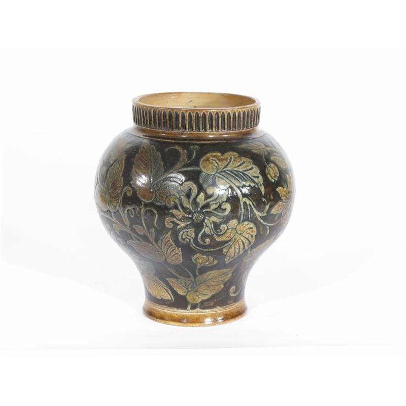 A Martin Brothers stoneware vase by Robert Wallace Martin, incised and painted with stylised flowers and foliage in shades of brown and green incised 5 6 84 R W Martin & Bros, London & Southall 22cm. high