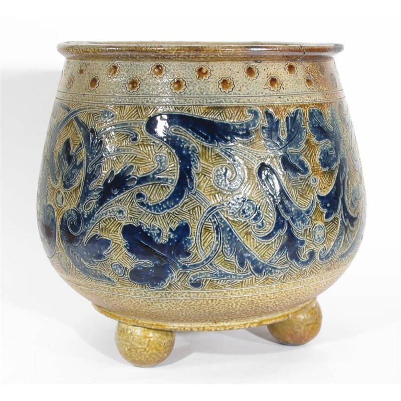 A massive early Martin Brothers stoneware jardiniere, by Robert Wallace Martin, dated 1880, ovoid on three ball feet, incised with a band of scrolling foliage in blue and brown incised 29.3.80 R W Martin London & Southall, damages 35cm. high