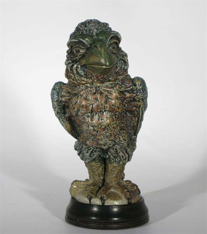 A Martin Brothers stoneware bird jar and cover by Robert Wallace Martin, upright posture with resigned forward gaze, glazed in blue, brown and ochre with green beak and eyebrows, on ebonised wood base incised R W Martin & Broths 25 9 1913 London & Southall to head and base, tiny frits to inner rim of neck 21.5cm. high Provenance The Martin Brothers Potters 31st October 2005 lot 54