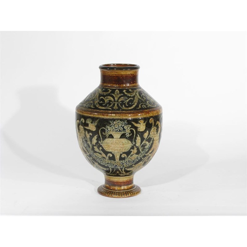 A Martin Brothers stoneware vase by Robert Wallace Martin, painted with classical putti and birds amongst wreaths and vases, in shades of brown incised 18-9-84 R W Martin & Bros, London & Southall, smashed and repaired 25cm. high