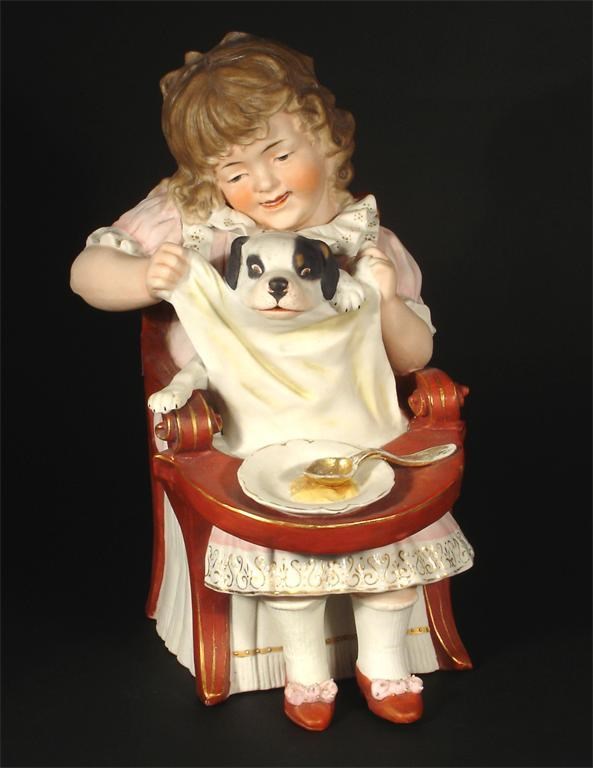 A German porcelain figure of a child and a puppy modelled seated in a high-chair, the child trying to put a bib on the puppy, naturalistically painted unmarked 32cm. high