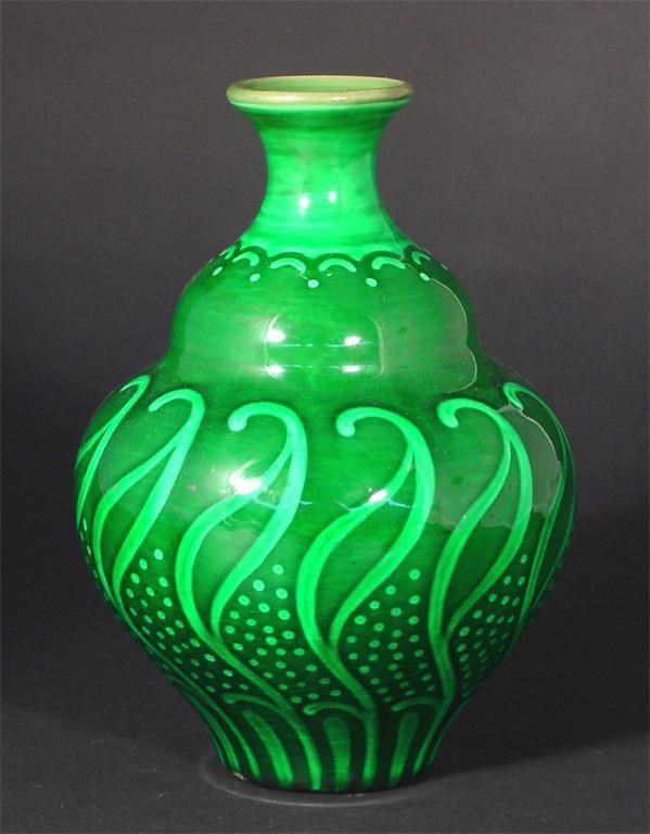 An unusual Pilkington's Lancastrian slip trailed vase circa 1903-1904 slip-trailed with foliate repeat under green glaze printed bee mark, collection paper label, chip to top rim 17cm. high Provenance The Bill Coles Collection