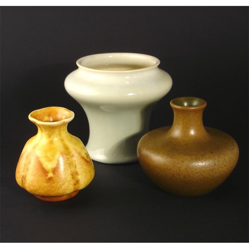A Pilkington's Lancastrian vase ribbed gourd form, covered in a matt yellow/orange glaze, a matt brown vase and a cream glazed vase printed bee and impressed marks, collection paper labels yellow vase 10.5cm. high Provenance The Bill Coles Collection