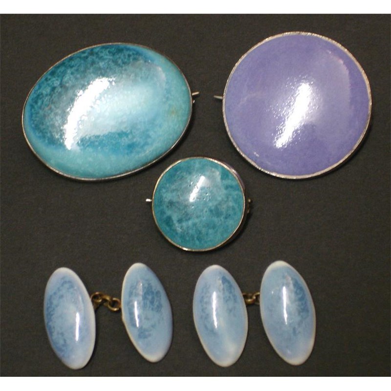 Three Ruskin Pottery stoneware brooches, with metal mounts and pins, two with blue and one purple souffle glazes, and a pair of stoneware cuff links impressed marks, one rim stamped silver rim largest brooch 3.5cm. wide.