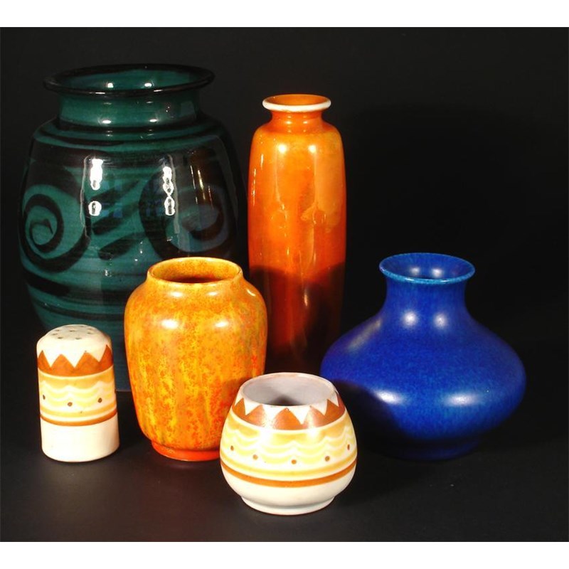 A Ruskin Pottery stoneware vase covered in an orange lustre glaze, two Pilkington's Lancastrian vases, a Cricklade vase and two pieces of Poole Pottery various marks, Ruskin dated 1913