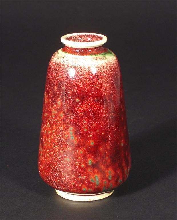 A Ruskin Pottery high-fired stoneware vase shouldered form sang de boeuf with green spotting and controlled silver shoulder and rim impressed marks datemark 1910, paper collection labels 13cm. high Provenance Albert E Wade Collection, Sotheby's 2002