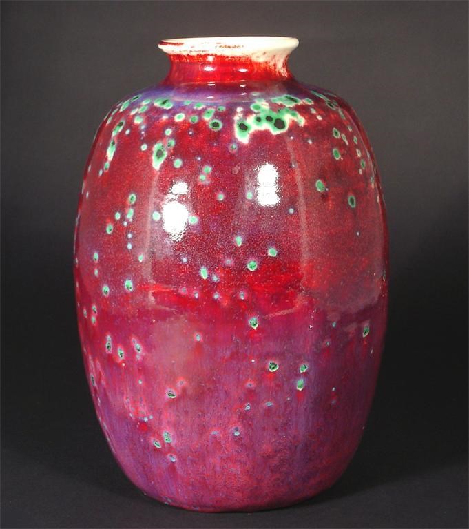 A Ruskin Pottery high-fired stoneware vase shouldered form, lavender and sang de boeuf spotted with mint green impressed marks dated 1926 25.5cm. high