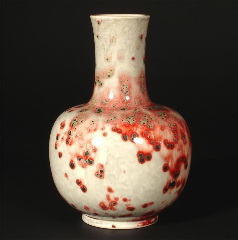 A Ruskin Pottery high-fired stoneware vase ovoid with cylindrical neck, covered in a silver-grey glaze with sang de boeuf and green spots and splashes impressed mark, date mark 1925, paper collection labels 17.5cm. high Provenance The Albert E Wade Collection, Sotheby's 2002