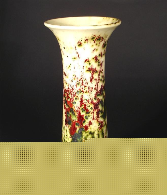 A Ruskin Pottery high-fired stoneware vase cylindrical form with flaring rim, covered in a speckled green and sang de boeuf glaze on cream impressed mark, date mark 1909, body hairline crack 24.5cm. high