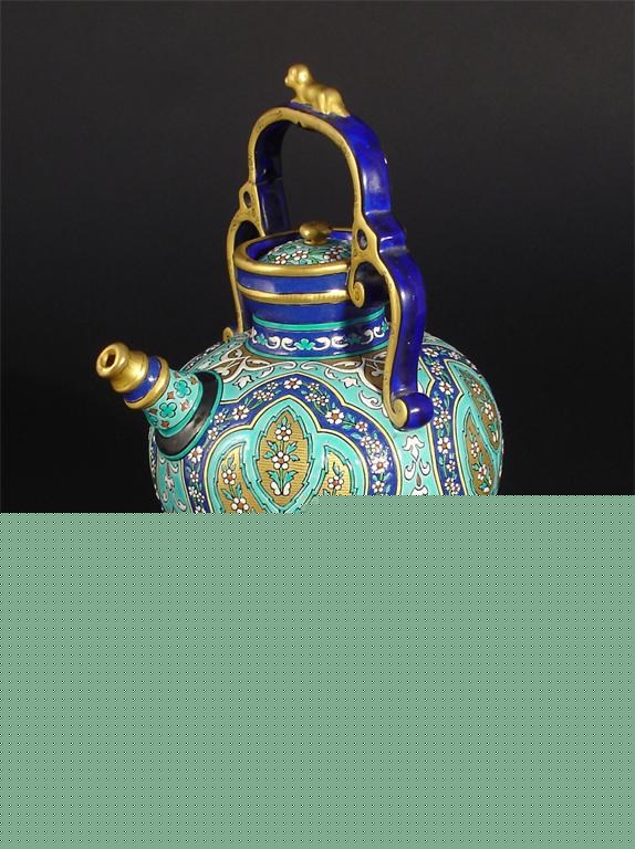 A Majolica ewer and cover probably French, decorated with Aesthetic Movement panels in shades of blue and gilt unmarked 25cm. high