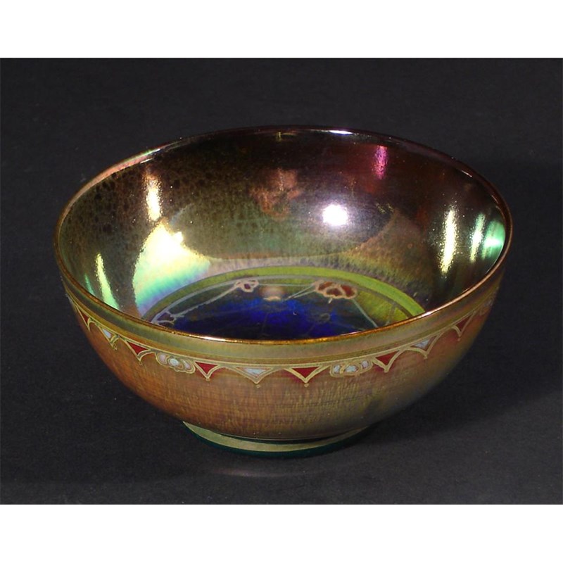 A Pilkington's Lancastrian bowl by Annie Burton, painted with simple flowerhead to well, in colours impressed factory mark, painted artist cypher 10.5cm. diam. Provenance The Bill Coles collection