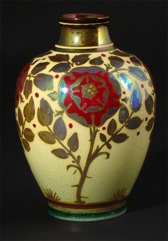 A Pilkington's Lancastrian vase by Richard Joyce, painted with Tudor rose flowers, in shades of ruby and copper lustre on a lemon ground 13.5cm. high Provenance The Bill Coles collection