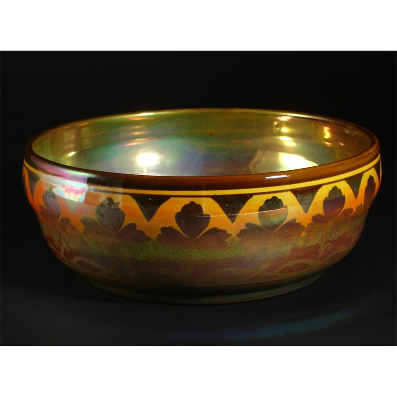 A Pilkington's Lancastrian bowl dated 1909, painted with a frieze of trefoil leaves in shades of gold and yellow lustre impressed mark, date mark, unknown painted datemark 18.5cm. diam.