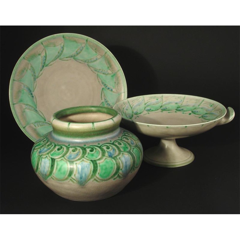 A Pilkington's Royal Lancastrian Lapis vase by Gladys Rogers and E T Radford, a tazza and a charger with similar decoration impressed and painted marks 16cm. high