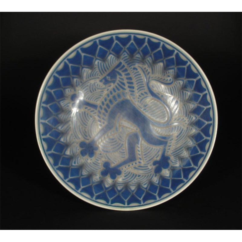 A Pilkington's Lancastrian bowl by William Mycock, decorated in resist with a heraldic lion in shades of blue impressed mark, artist cypher and datemark probably 1932 27cm. diam.