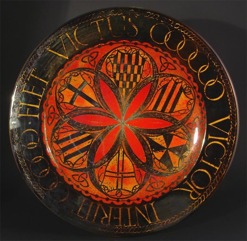 'The Conquered Mourns The Conquerer is Undone' A Pilkington's Lancastrian charger by Gladys Rogers, decorated with the well with shields, the rim with inscription impressed and painted marks to reverse, impressed datemark 1911, minor firing faults 48.5cm. diam.