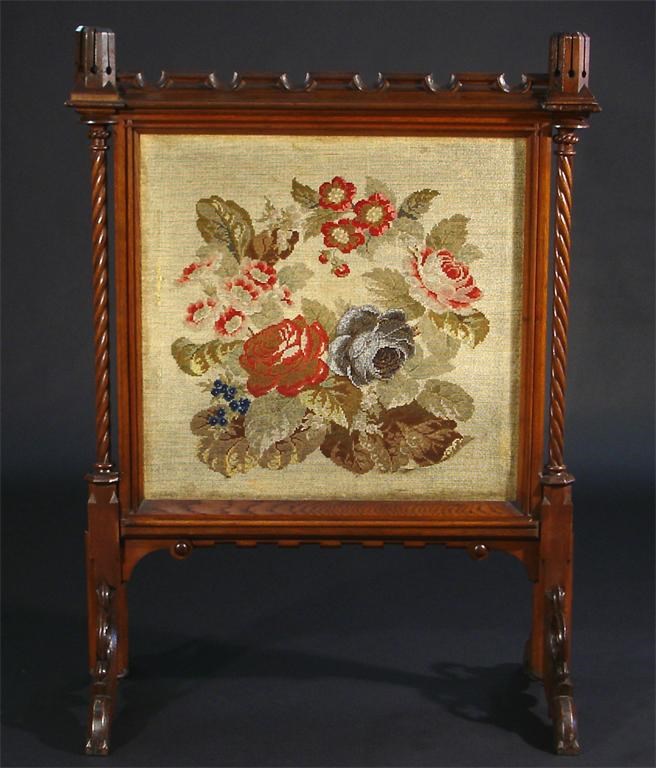 A Gothic oak firescreen with turret finials, ropetwist columns and pierced modelled feet unmarked 120 x 89cm It has been suggested the firescreen came from Eastnor Castle in Herefordshire
