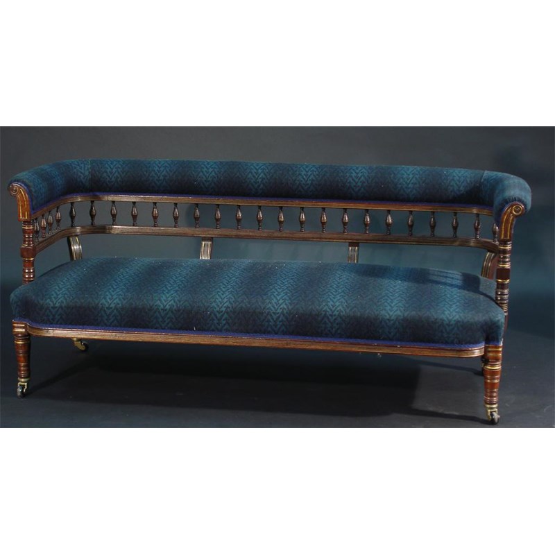 An Aesthetic Movement ebonised wood sofa attributed to Collinson & Lock in the style of E W Godwin, with padded seat and back rail unmarked 165cm. wide
