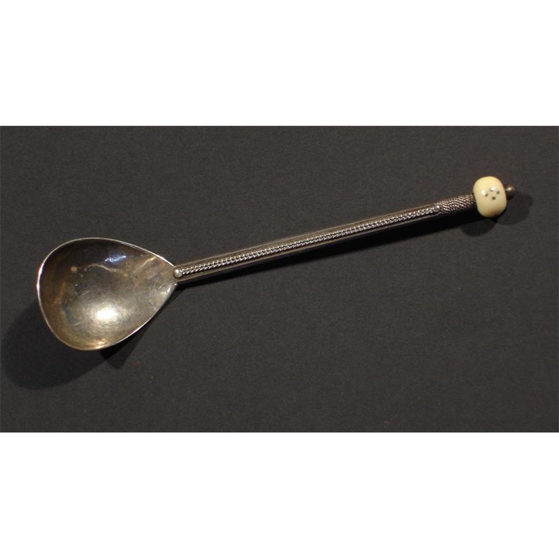 An Artificers Guild Ltd silver and ivory spoon, probably designed by Edward Spencer hammered bowl with applied chevron design to handle and inset ivory ball finial stamped marks London 1914 13cm. long Charlotte & Peter Fiell 1900s 1910s Decorative Art Taschen page 363 a reprint of The Studio 1913 with a comparable spoon designed by Edward Spencer illustrated