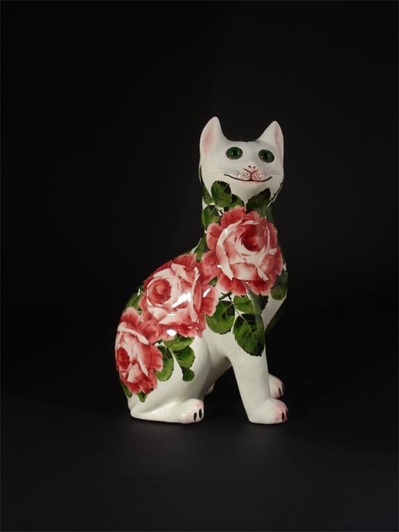 A Wemyss Ware pottery cat modelled seated, painted with Cabbage Rose, applied glass eyes painted Wemyss Ware Made in England 32.5cm. high