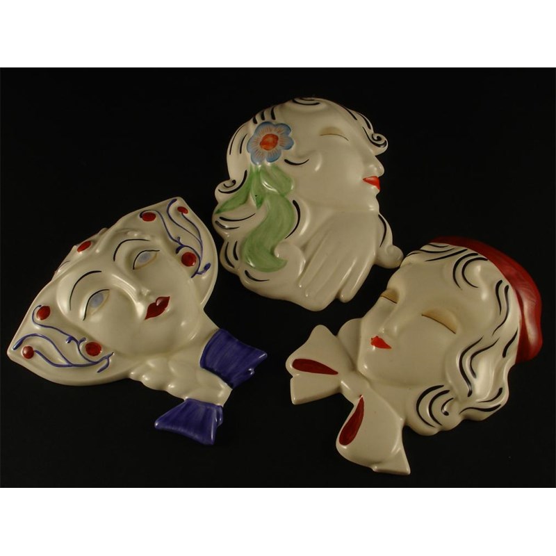 Six Wedgwood Clarice Cliff Bizarre wall masks a Sunburst vase and a Bizooka printed and painted marks 13cm. high