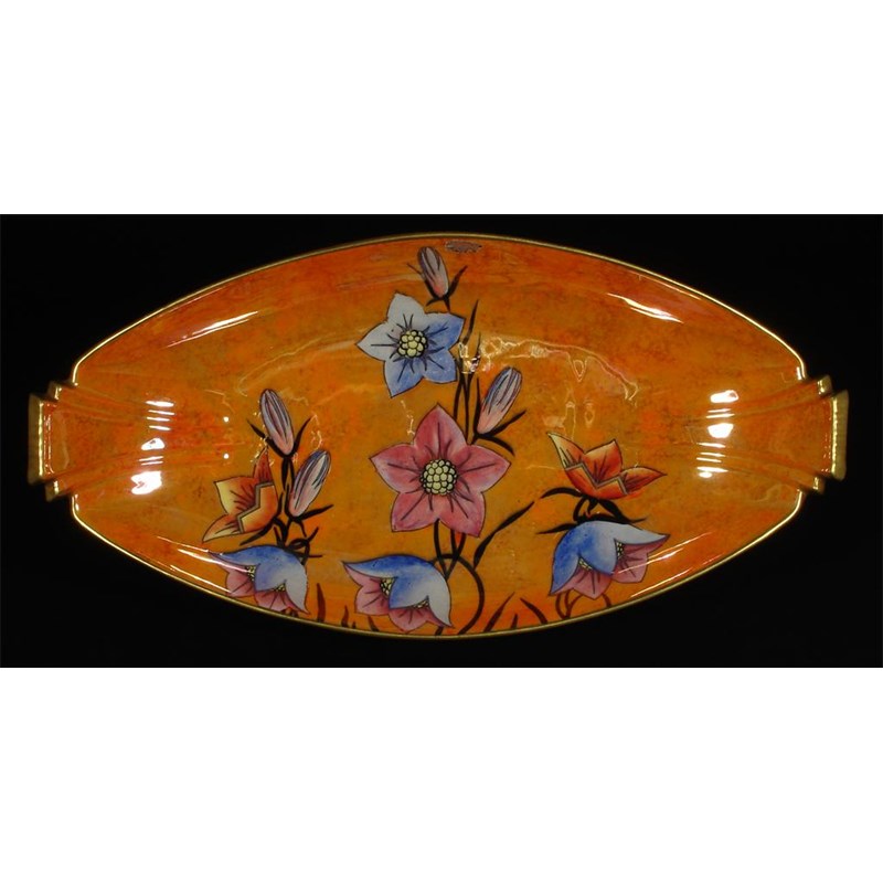 A Carlton Ware twin-handled dish pattern no.4154 printed and painted with anemone type flowers on an orange lustre ground printed and painted marks, paper label 32cm. wide.