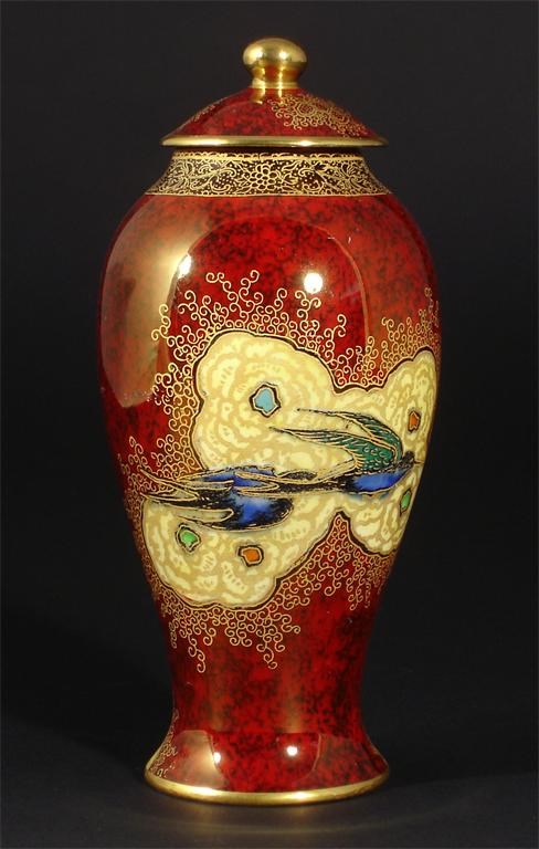 'Swallow and Cloud' a Carlton Ware vase and cover, pattern no.3074 printed in colours and gilt on a red lustre ground printed and painted marks 19cm. high