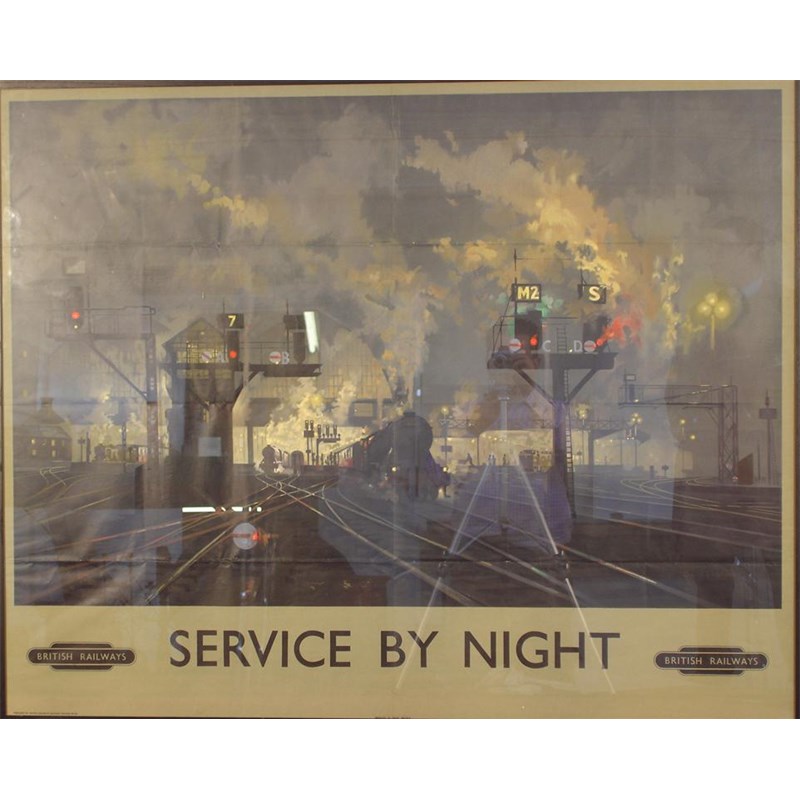 'Service by Night' a King's Cross, British Railways, Eastern Region poster by David Shepherd, Lithograph in Colours, 1955, printed by Waterlow & Sons Ltd, London, unmounted and framed 102 x 127cm approx, frame size 133 x 108cm.