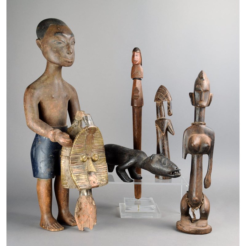 and a Bambara female figure, a Mossi doll, a Kota janus reliquary, a carved animal and a figural staff. (6)