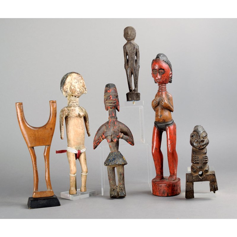 wood, including two Nigerian with red paint, another Fante with remains of white pigment and an Cameroon pulley, an Indonesian standing figure and a Baule catapult, both on stands,