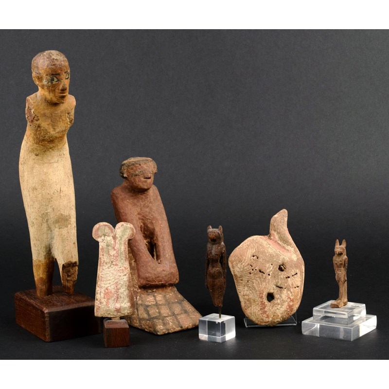 a kneeling figure, a lion headed goddess deity, a walking jackal headed Anubis, a small hand from a sarcophagus lid and a feather plume cresting, with stands. (11)
