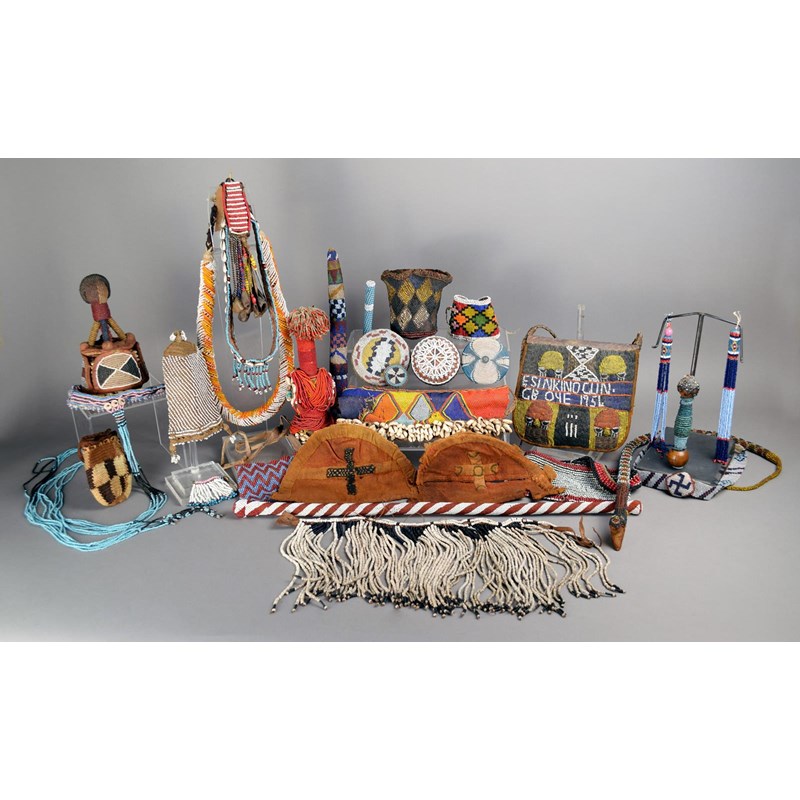 including neck and waist bands, earrings, a bag, a staff, a beaker, a Fali doll, a divination tapper, another bag dated 1954 and a Yoruba ibori,