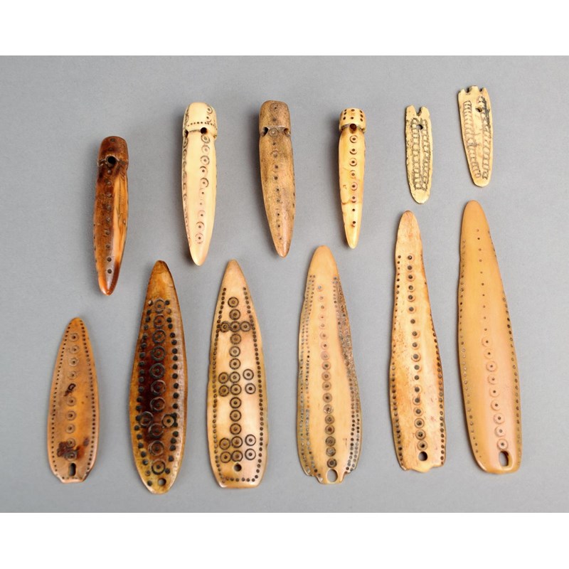 four tooth-like pendants and two smaller with carved decoration. (12)