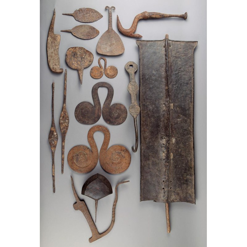with a small collection of currency, including three Kirdi double scrolls, two Mumuye rods, a Nigerian hoe. (15)