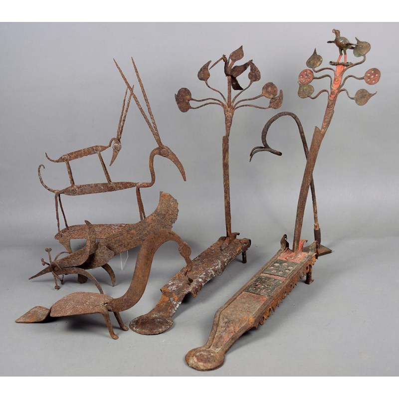 Six Nigerian / Mali zoomorphic ironworks including one with polychrome decoration and a bird in a...