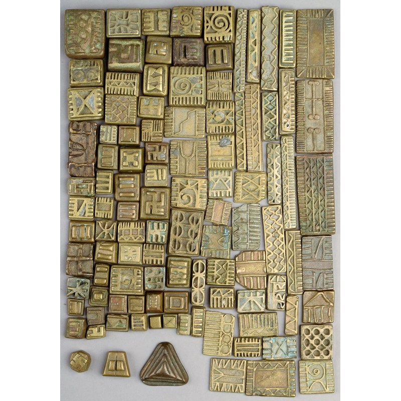 A collection of Ashanti gold weights Ghana brass with cast geometric designs