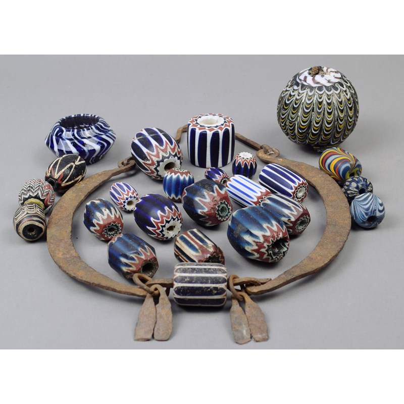 nine similar six-layer beads, and another on an iron neckpiece, together with eight various glass beads. (25)