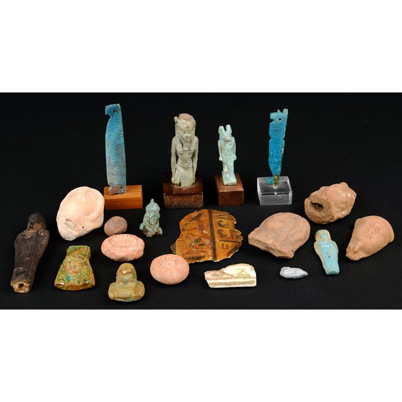 a faience Nefertum amulet fragment, two faience stylised amulets, a falcon head amulet fragment wearing a double crown, a aubergine glazed shabti, another turquoise, two head amulets, an udjat eye amulet, two terracotta rosette moulds, another with white pigment, a painted hieroglyph fragment and four terracotta heads. (22)
