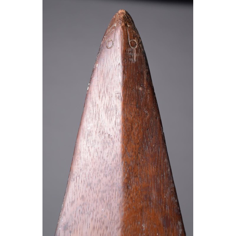 wood with a leaf shape blade having a swollen tip decorated as an animal head, with relief scroll carving and piercing to the base, the shaft with a tapering terminal,
