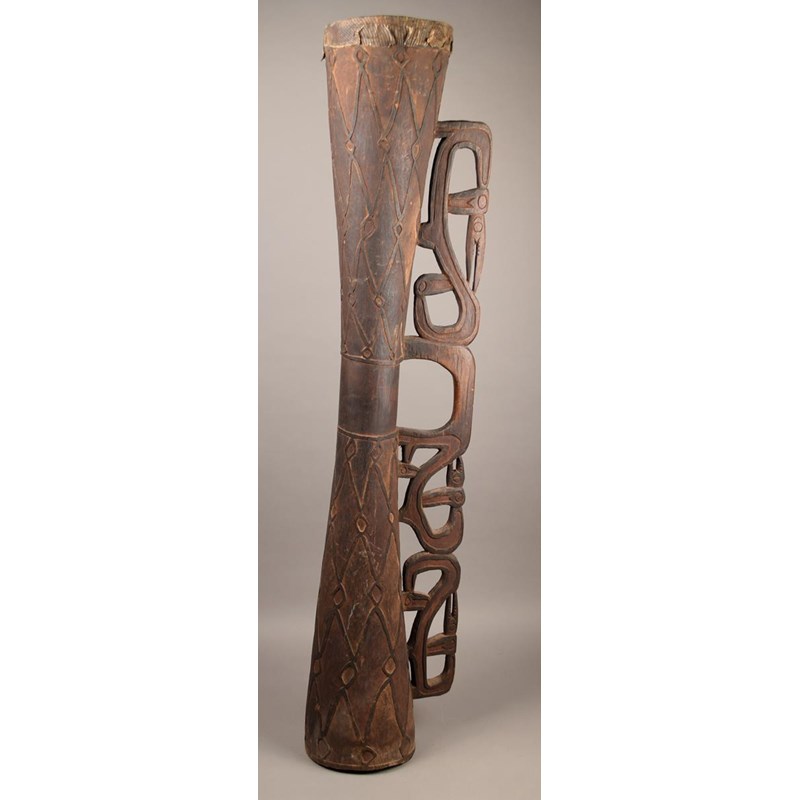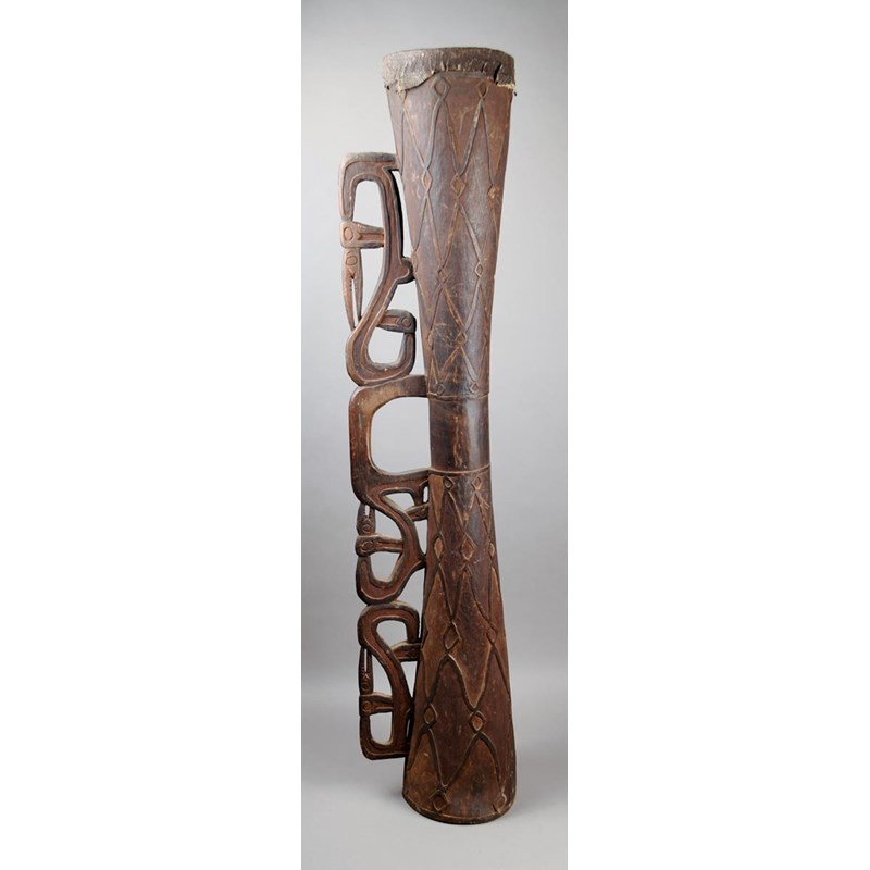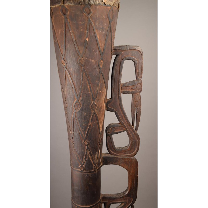 An Asmat large drum Papua New Guinea wood of hour glass form with relief carved zig-zag decoration