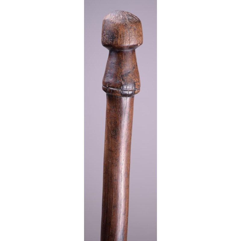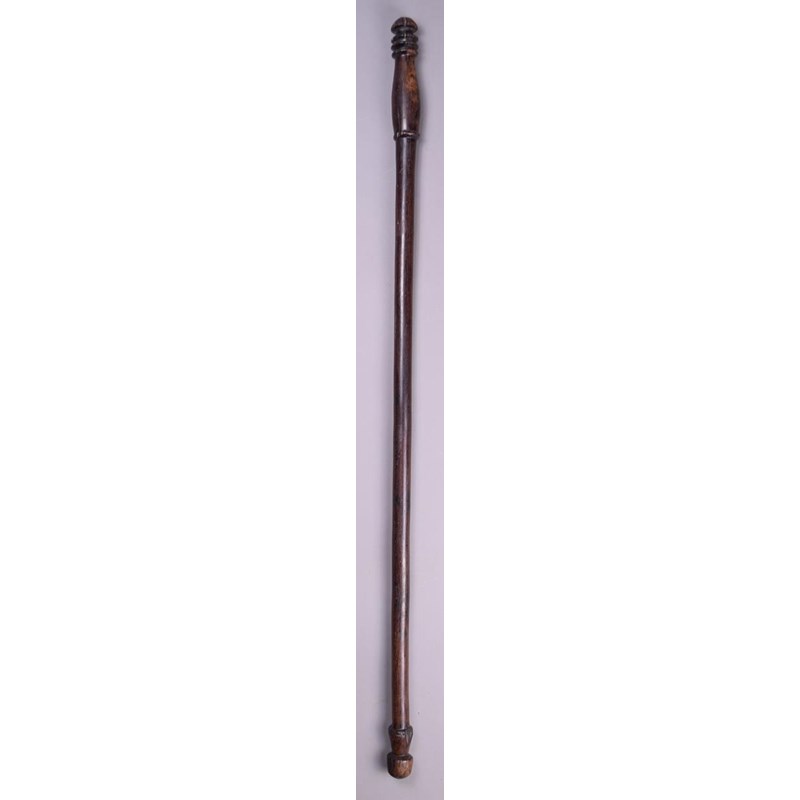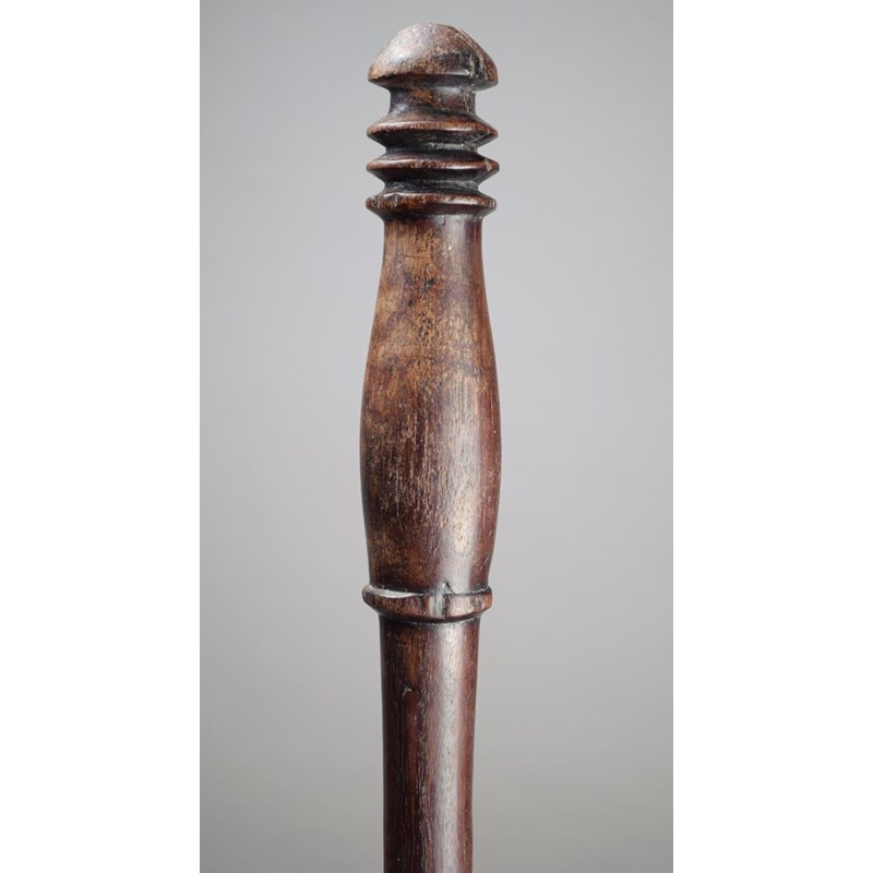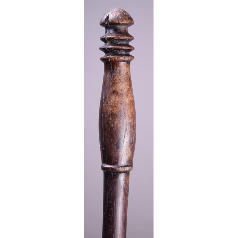 wood with a domed and ringed swollen finial, the shaft with a stepped tapering and domed butt,