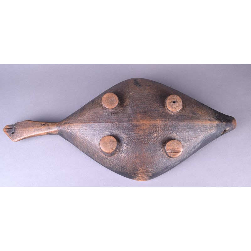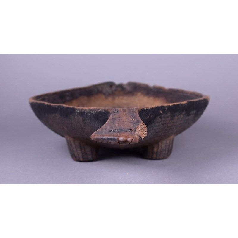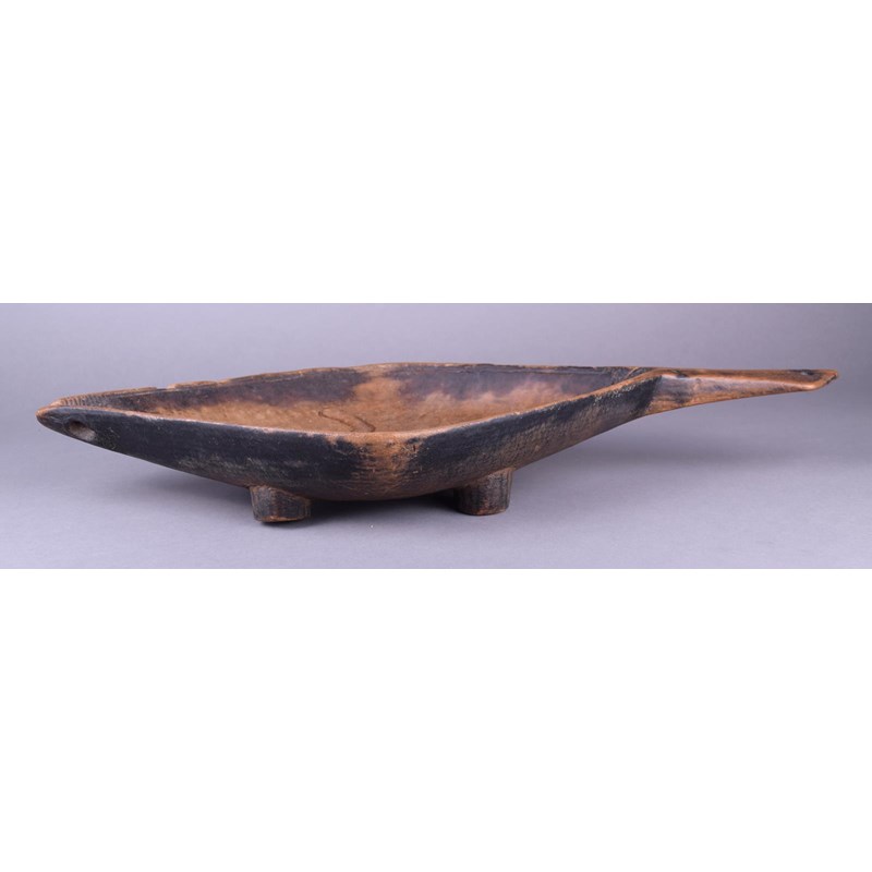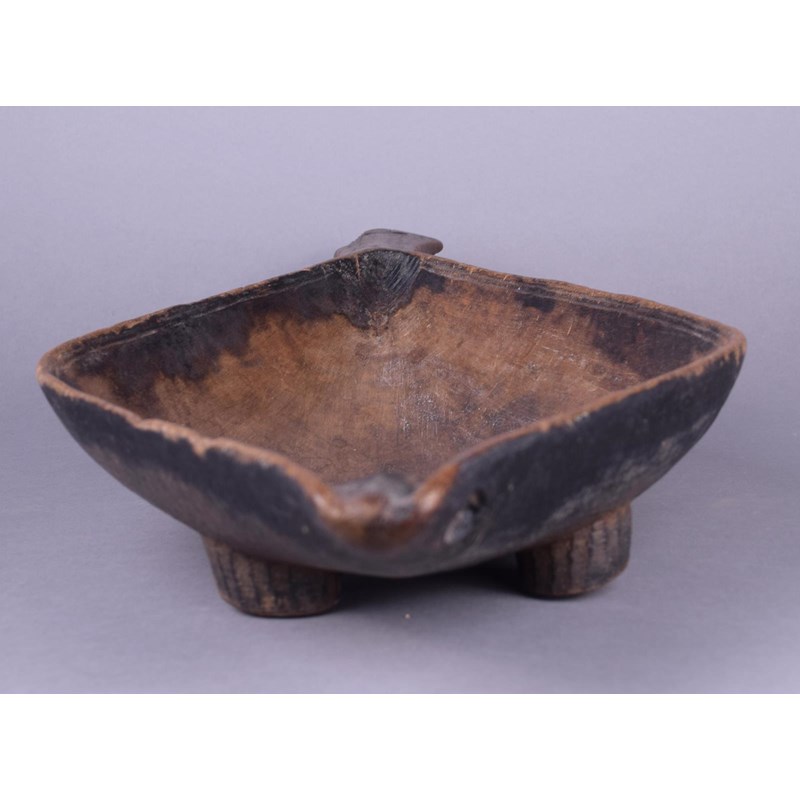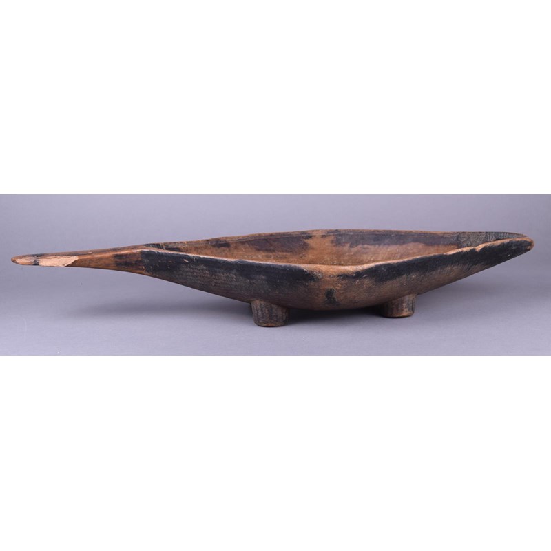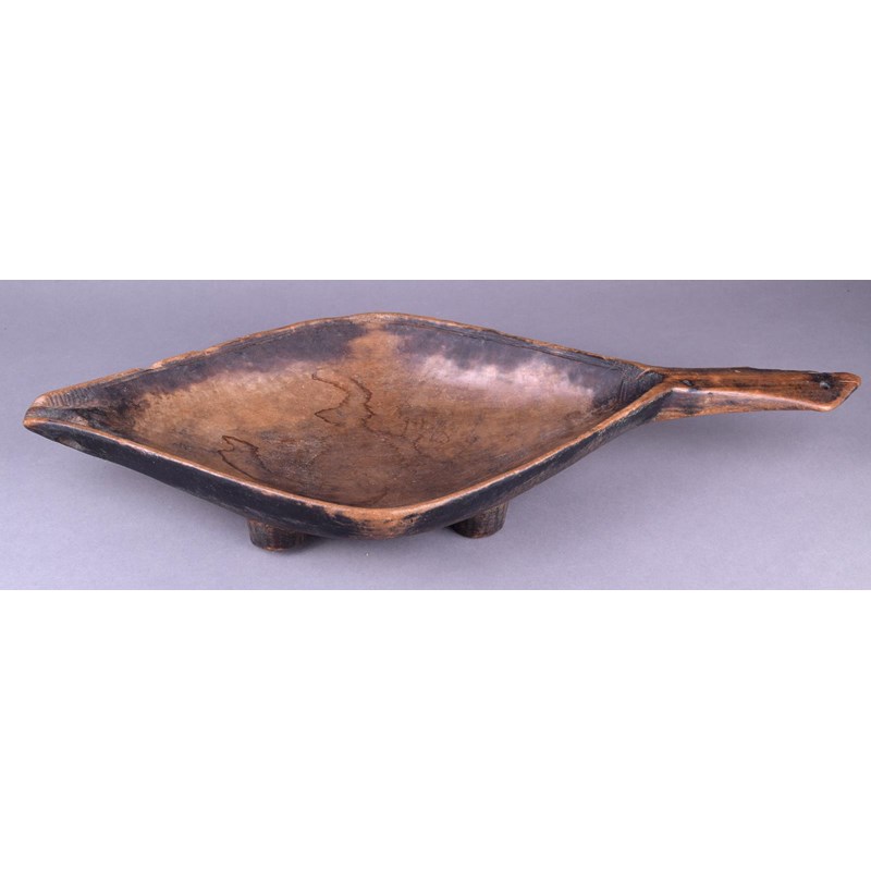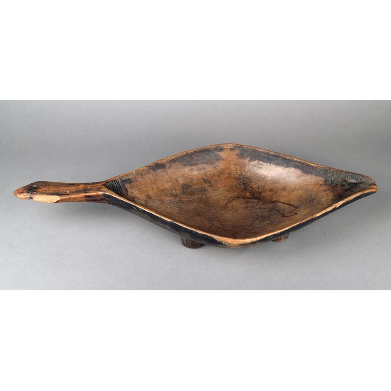 wood of rhomboid form with a grooved spout and short handle and raised on four short feet, the underside with adze markings,