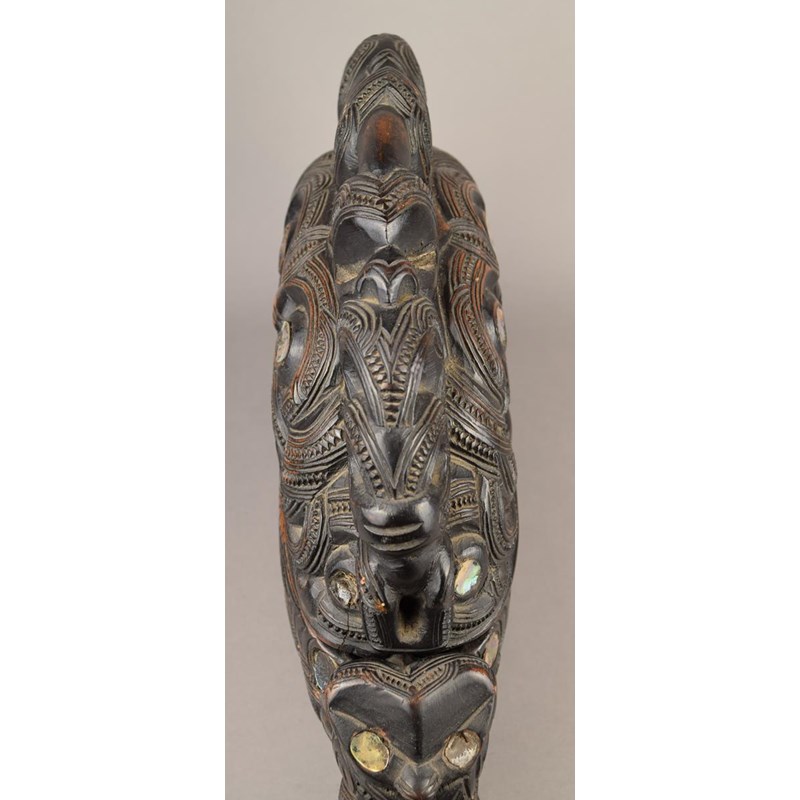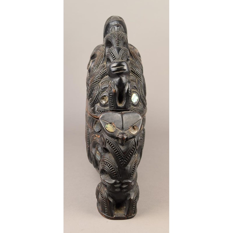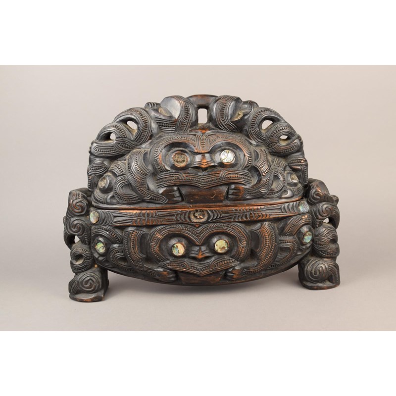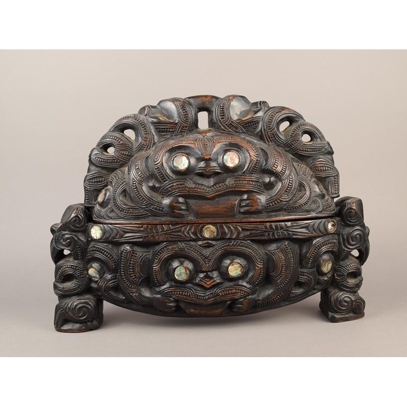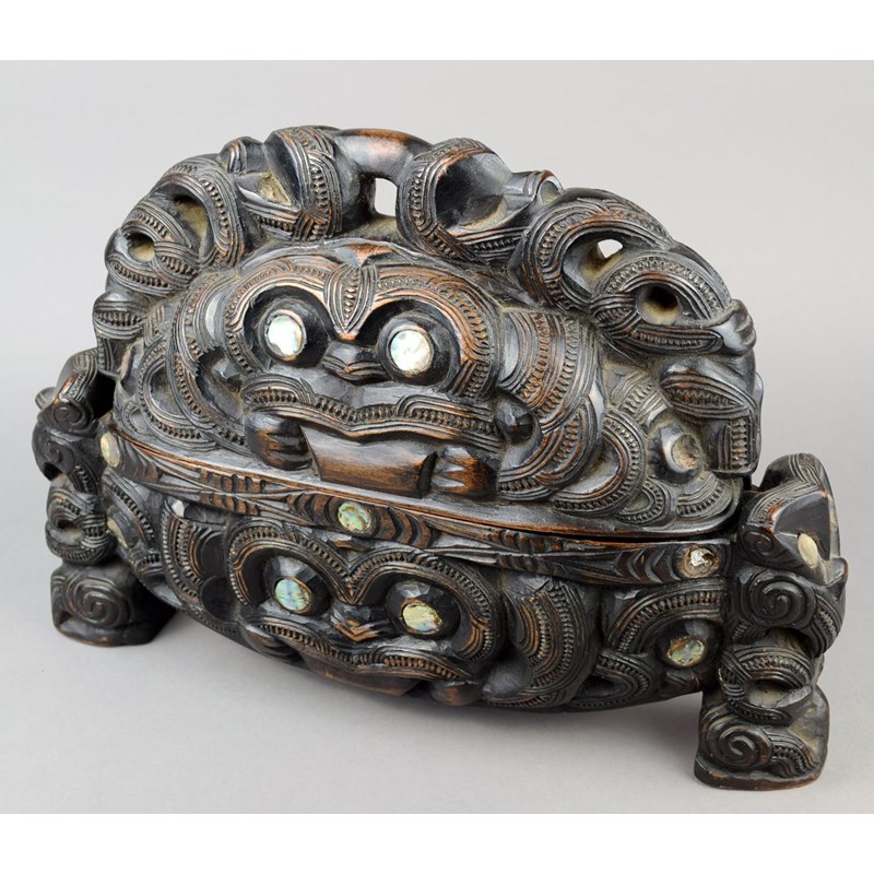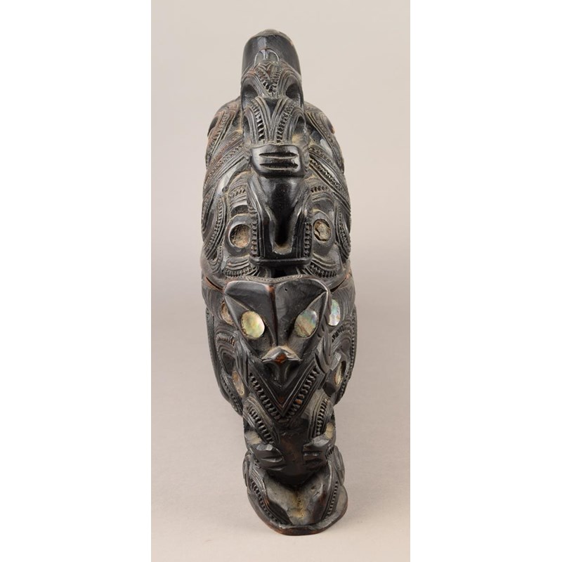 A Maori feather box and cover New Zealand wood with a dark stain and abalone shell inlay