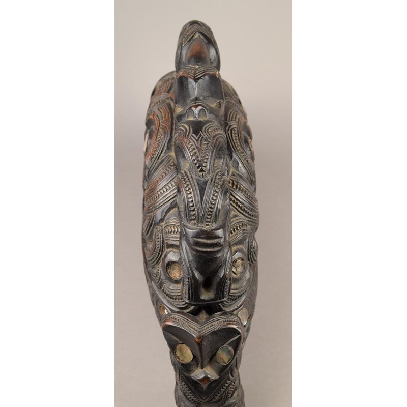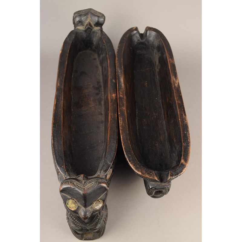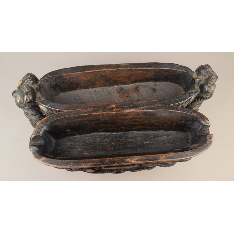 wood with a dark stain and abalone shell inlay, oblong with traditional carving of masks and tikis,